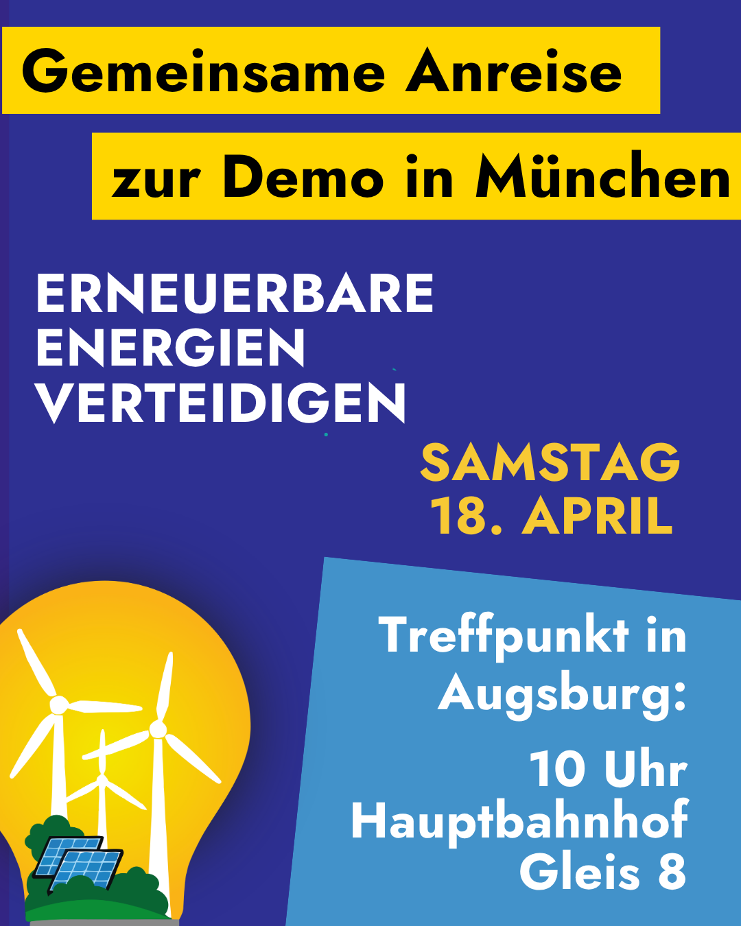 Erneuerbare Energien verteidigen! Am 18.04. gehen Menschen in München, Köln, Hamburg und Berlin für saubere Energien und gegen fossile Lobbypolitik auf die Straße. Aus Augsburg fahren wir gemeinsam mit dem Zug um 10:08 zur Demo nach München.
