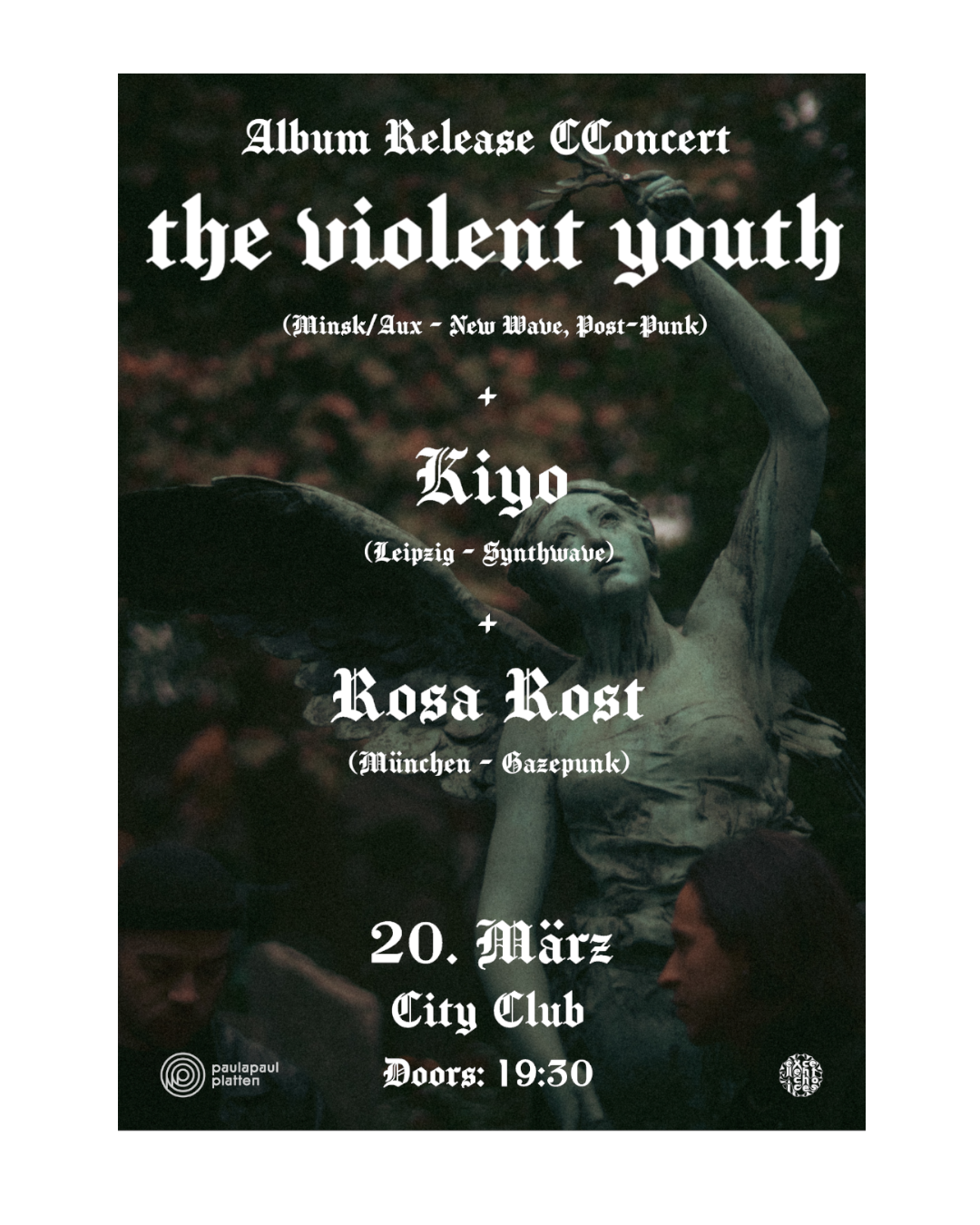 The Violent Youth (New Wave, Post Punk / Minsk, Augsburg) sind mit neuem Album zurück! „tsvety“ („flowers“) setzt die Erkundung modernen New Waves und Post-Punks durch das in Augsburg lebende Duo fort und verortet ihren Sound innerhalb des Darkwave- und Synth-Pop-Revivals, das durch Bands wie Molchat Doma populär wurde. In Anlehnung an die dunklere Ausrichtung ihrer früheren Werke ist „tsvety“ eine Mischung aus tanzbaren Rhythmen und verletzlichen, emotionalen Texten, die universelle Themen wie Distanz, Verlust und Hoffnung behandeln, während gleichzeitig die für die Band charakteristische, von den 80er Jahren inspirierte synthetische Atmosphäre und der fesselnde Gesang beibehalten werden.