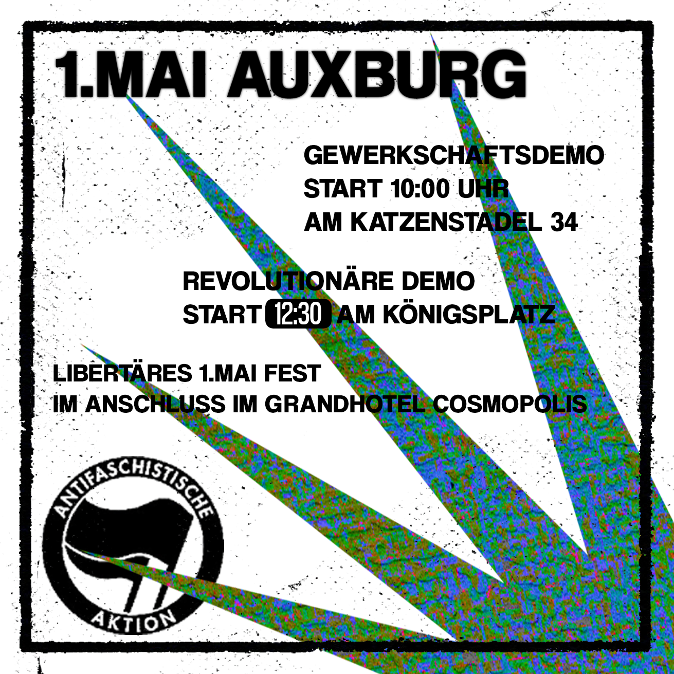 Augsburg KönigsplatzDer erste Mai in Augsburg: Gewerkschaftsdemo: 10 Uhr, Am Katzenstadel 34 Revolutionäre Demo: 12:30, Königsplatz Libertäres 1. Mai Fest: im Anschluss, Grandhotel Cosmopolis Kapitalismus, scheiße wie noch nie - für den Kommunismus und die Anarchie!