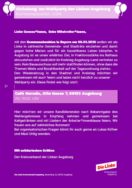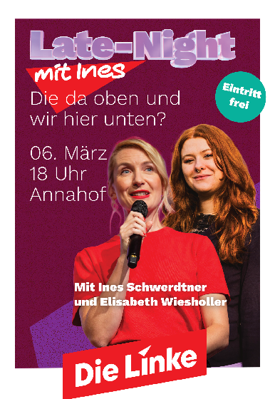Ines Schwerdtner, Parteivorsitzende der Linken und direkt gewählte Bundestagsabgeordnete kommt nach Augsburg! Bekannt durch ihre lange journalistische Tätigkeit und ihr politisches Wirken wird Ines gemeinsam mit Elisabeth Wiesholler, OB-Kandidatin der Linken in Augsburg, darüber sprechen, für wen Politik eigentlich da ist. Während die Armen immer ärmer werden, machen sich die Reichen die Taschen voll! Der...