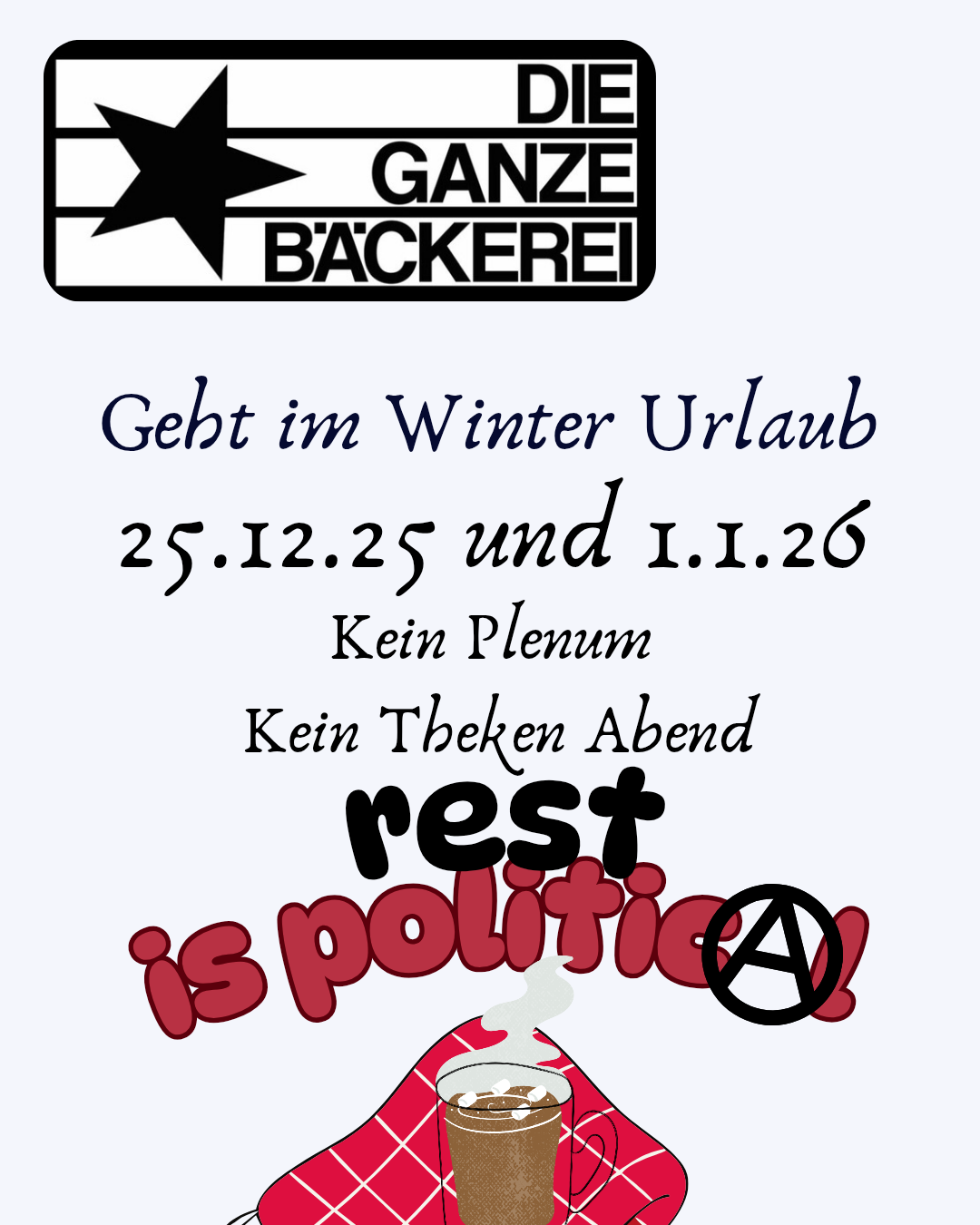 Wir gehen in den Winterurlaub!Am 25.12.25 und am 01.01.2026 ist der Laden nicht offen und wir haben auch kein Plenum. Am 08.01.2026 geht es dann wieder normal weiter. Bis dahin habt ne Gute Zeit und einen tollen Jahreswechsel!Gebt aufeinander acht, wir freuen uns auf euch im neuen Jahr! 🖤💜