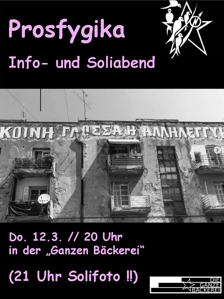 Wir wollen am Donnerstag Abend auf den Angriff der besetzten Gemeinschaft Prosfygika durch die Regierung der Region Attika in Athen aufmerksam machen. Lasst uns gemeinsam Essen und über die aktuelle Situation in Prosfygika reden. Es wird Infomaterialien und Merch (Feuerzeuge, Shirts, Pullis ....) geben. Um 21 Uhr möchten wir ein Soli-Foto für unsere Freund*innen und...